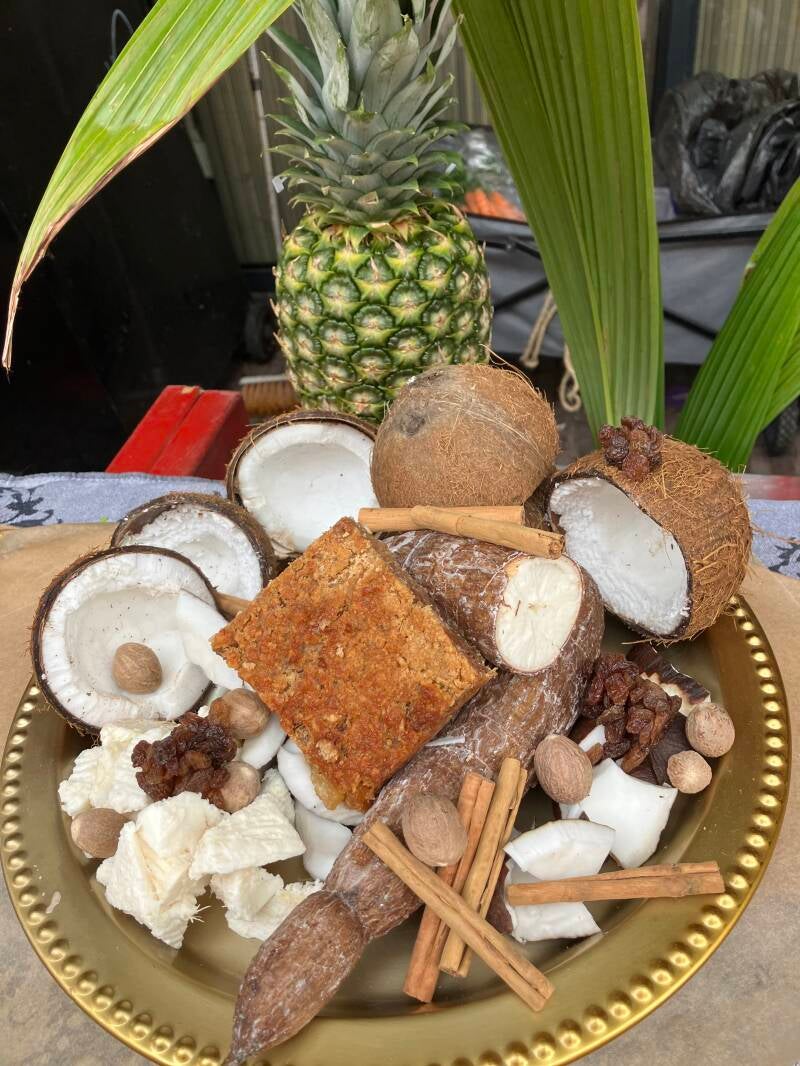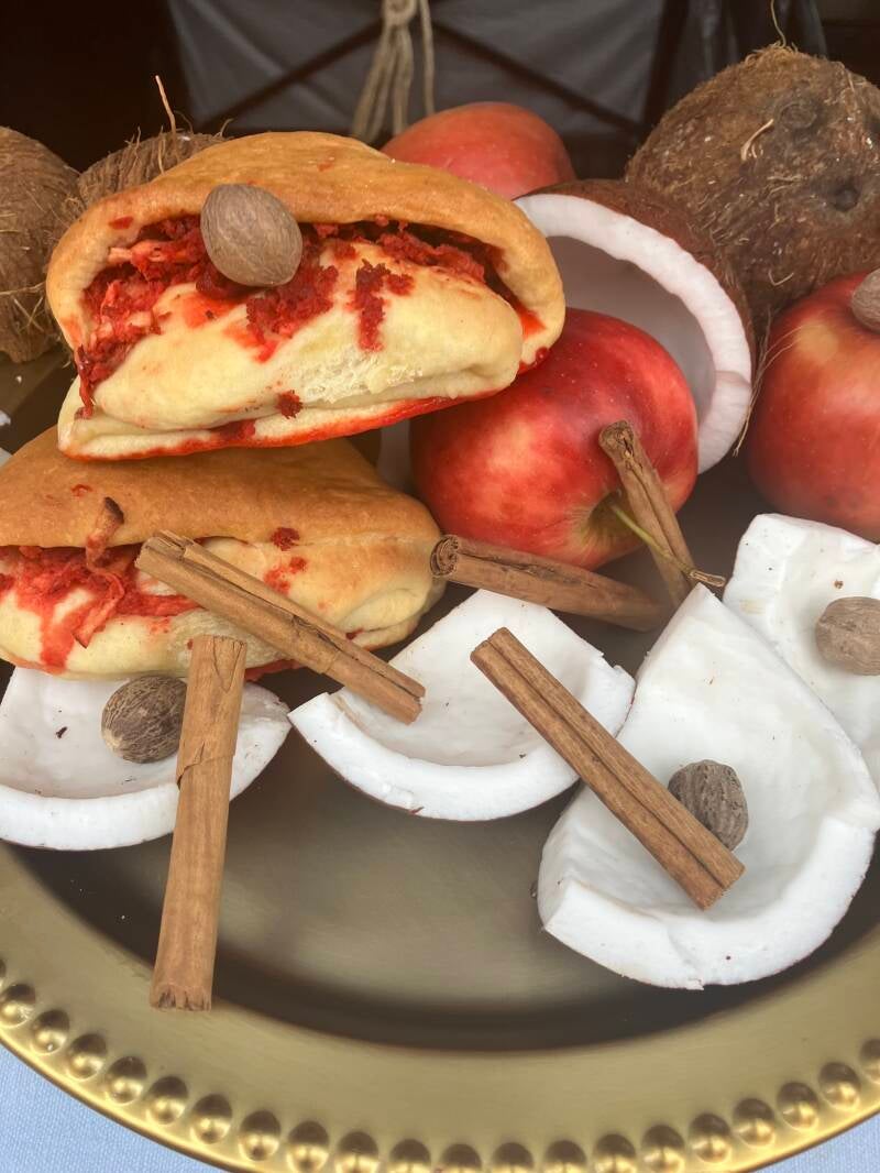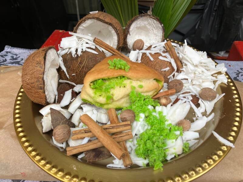 Kokosbrood ( het rode is vers geraspte kokosnoot rood gekleurd op smaak gebracht met suiker, kaneel en nootmuskaat )