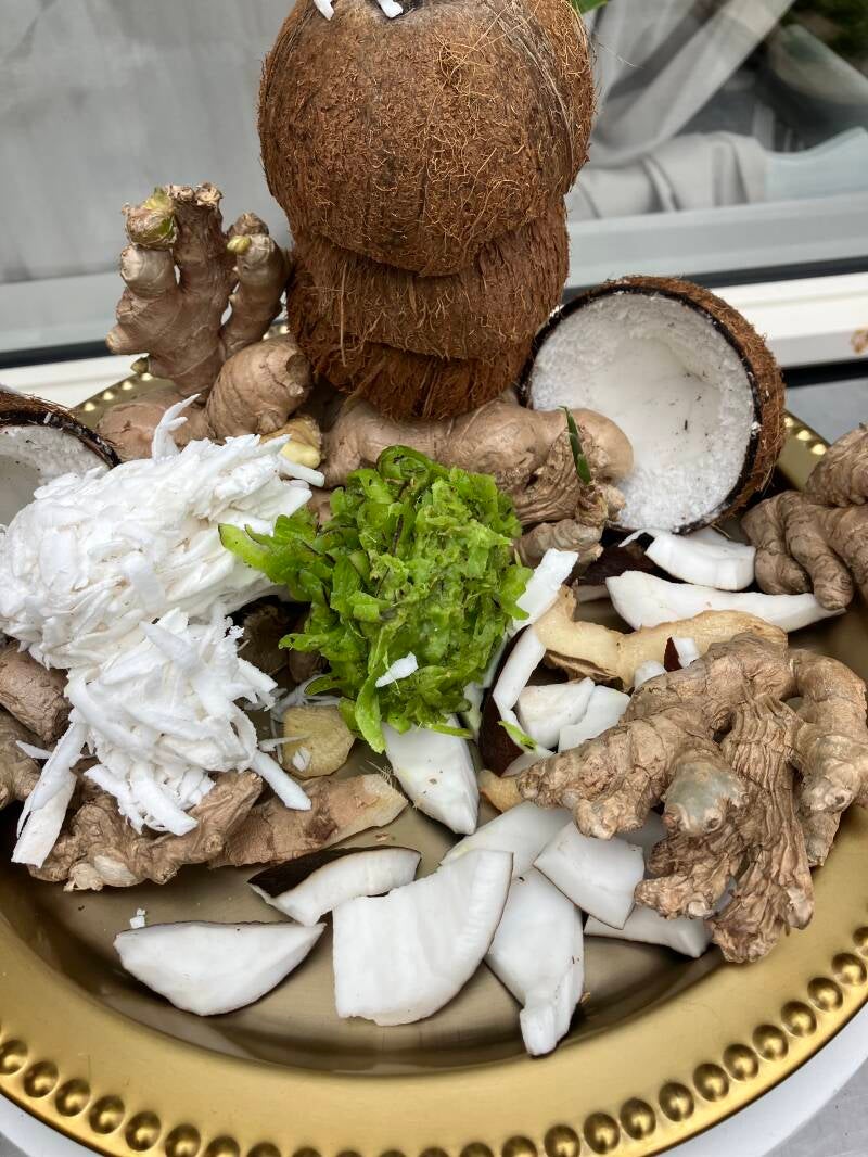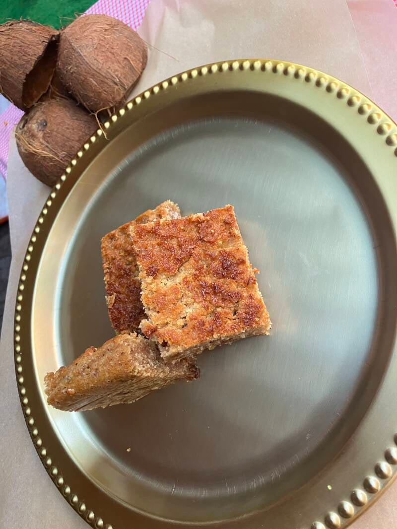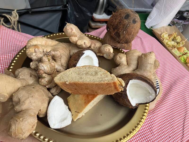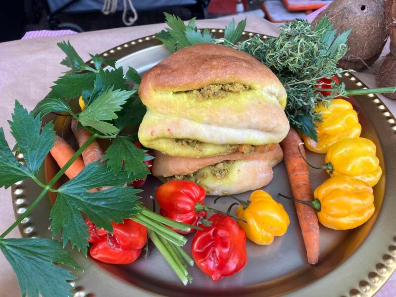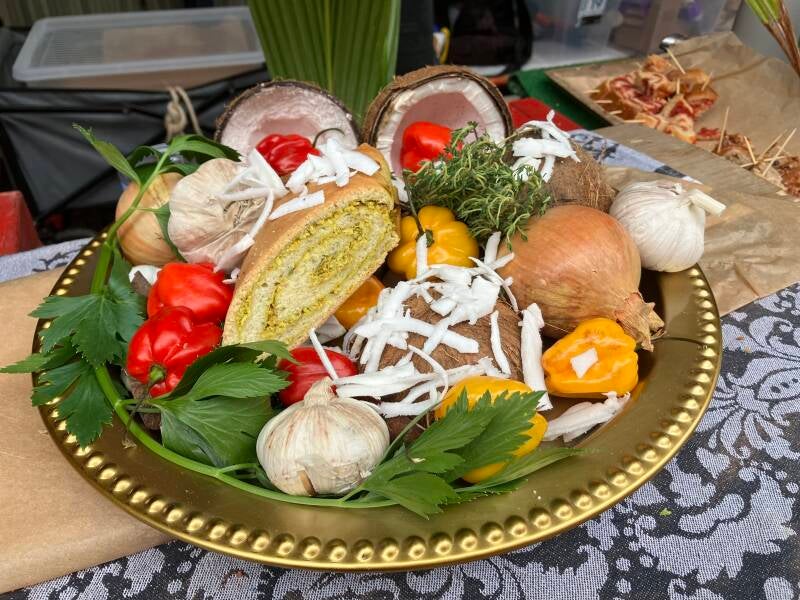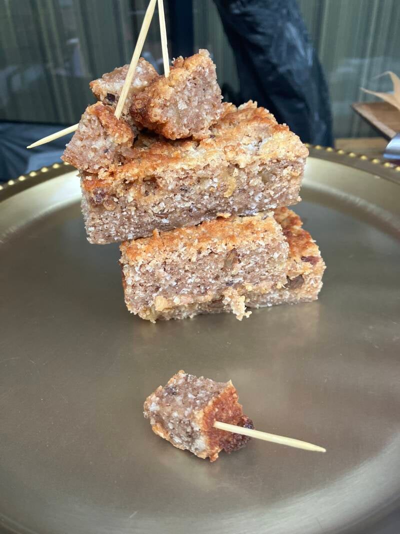 Johnny cake met bakkeljauw, garnalen, verse peper, uien en knoflook.