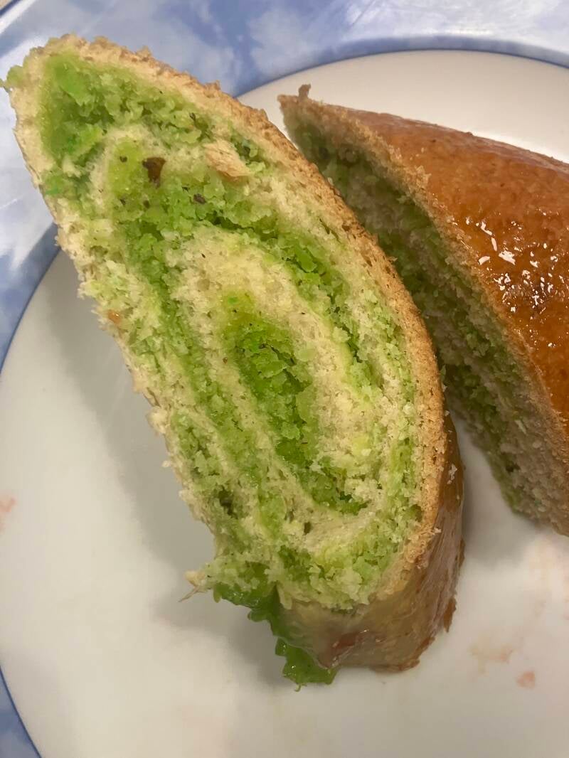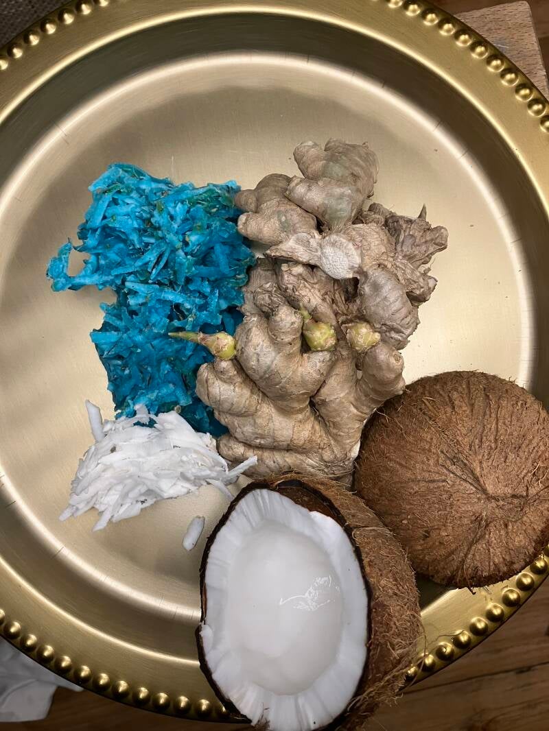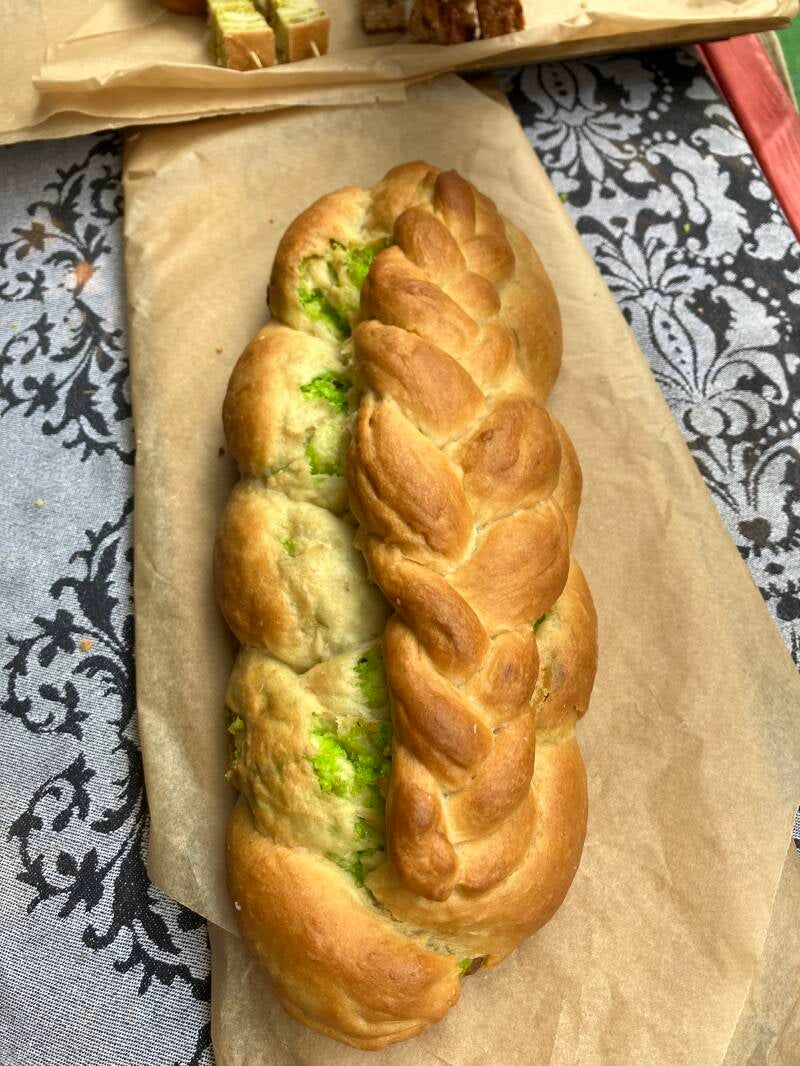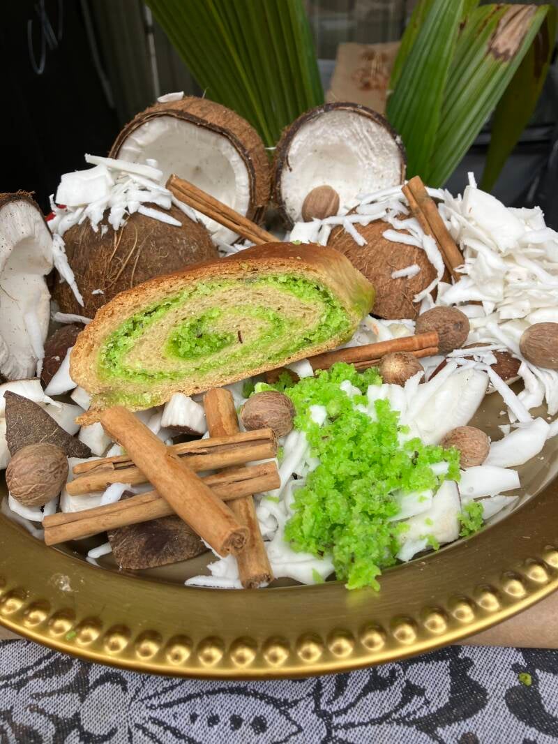 Johnny cake met bakkeljauw, garnalen, verse peper, uien en knoflook.